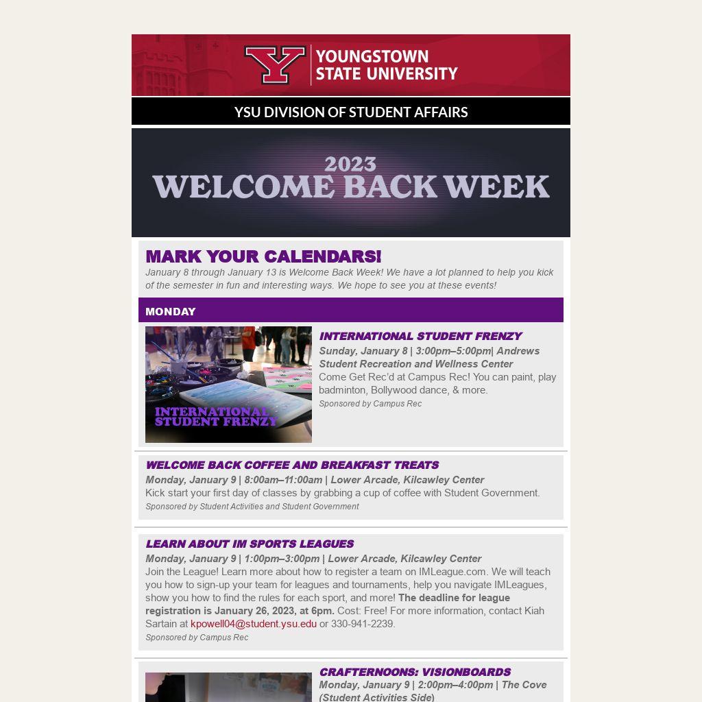January 8 through January 13 is Welcome Back Week! We have a lot planned to help you kick of the semester in fun and interesting ways. We hope to see you at these events!