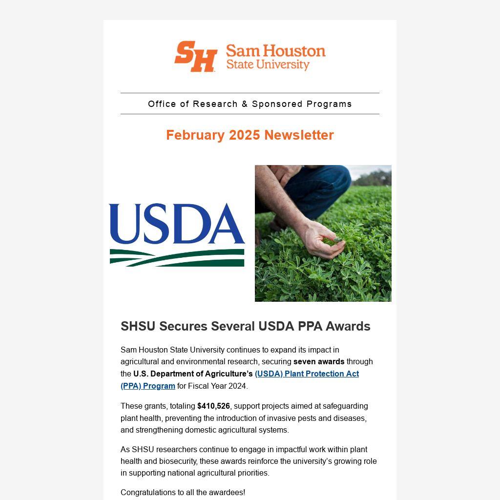 We appreciate the dedication of SHSU faculty in advancing research that addresses critical societal and environmental challenges. This year, five SHSU researchers have been awarded funding through the USDA Plant Protection Act (PPA) program, securing support for projects that contribute to plant health, pest management, and agricultural sustainability.