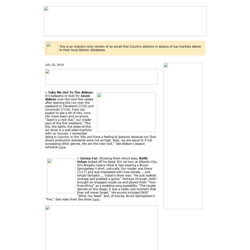 Birthdays Friday (7/25): Marty Brown. Saturday (7/26): Al Anderson. Sunday (7/27): Bill Engvall, Bobbie Gentry, Duncan Cameron (Sawyer Brown), Stacy Dean Campbell. Monday (7/28): Ray Vega, Jonathan Edwards. On TV Sunday (7/27): Brad Paisley, Rising Star (ABC) Monday (7/28): Dwight Yoakam, Under The Dome (CBS) Upcoming Album Releases Aug. 5 Sunny Sweeney Provoked Billy Joe Shaver, Long In The Tooth Aug. 19 Nashville Outlaws: A Tribute To Mötley Crüe Chase Rice Ignite The Night Randy Travis, Influence Vol. 2: The Man I Am Various, Look Again To The Wind: Johnny Cash's Bitter Tears Revisited Joel Crouse, Even The River Runs Sarah Dunn Band, You Or The Whiskey Aug. 26 Brad Paisley Moonshine In The Trunk Brushville, Self-Titled Sep. 2 Terri Clark Some Songs |
