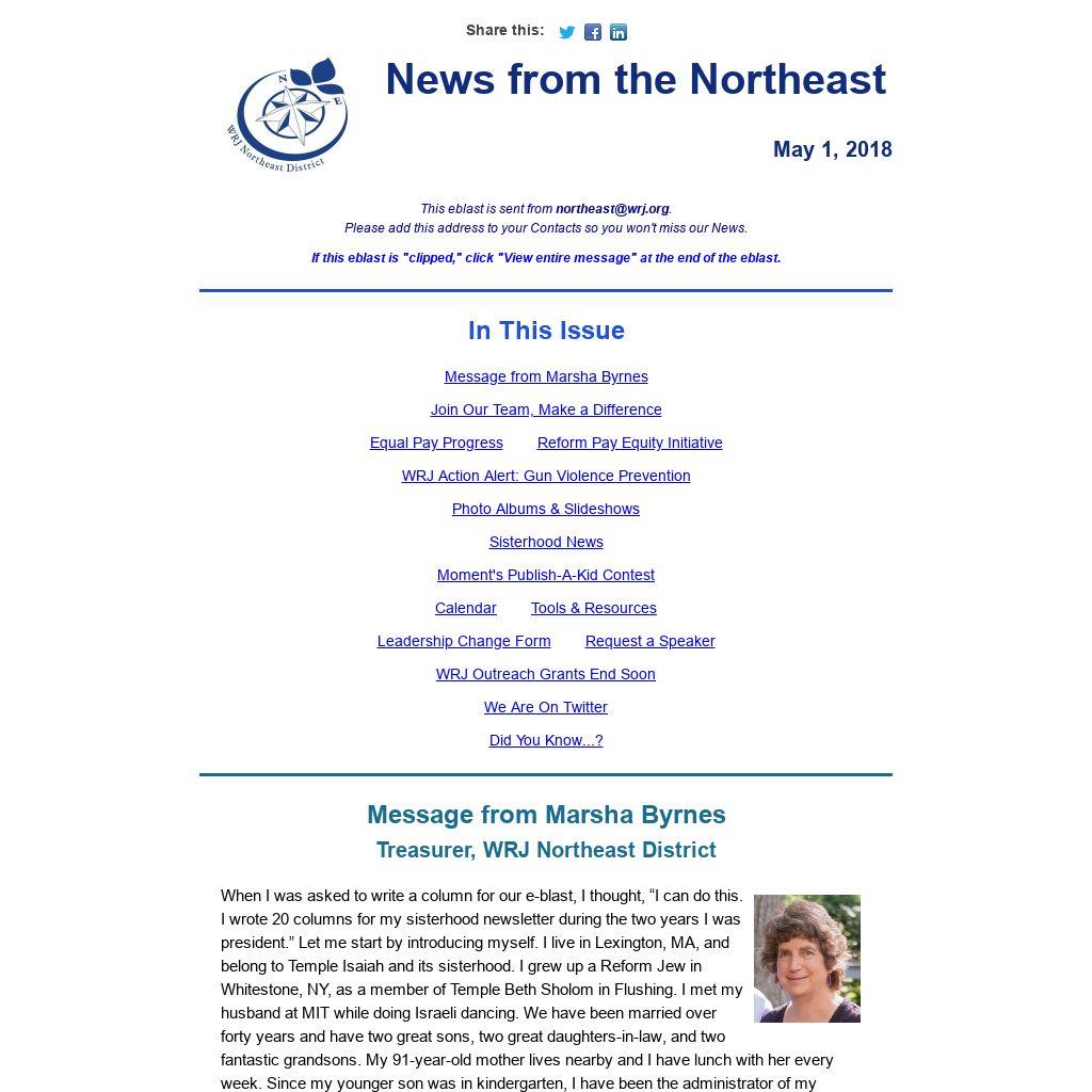 Share this newsletter by using one of the "Share this" icons at the top of the newsletter. The next eblast will be sent on June 5, 2018.