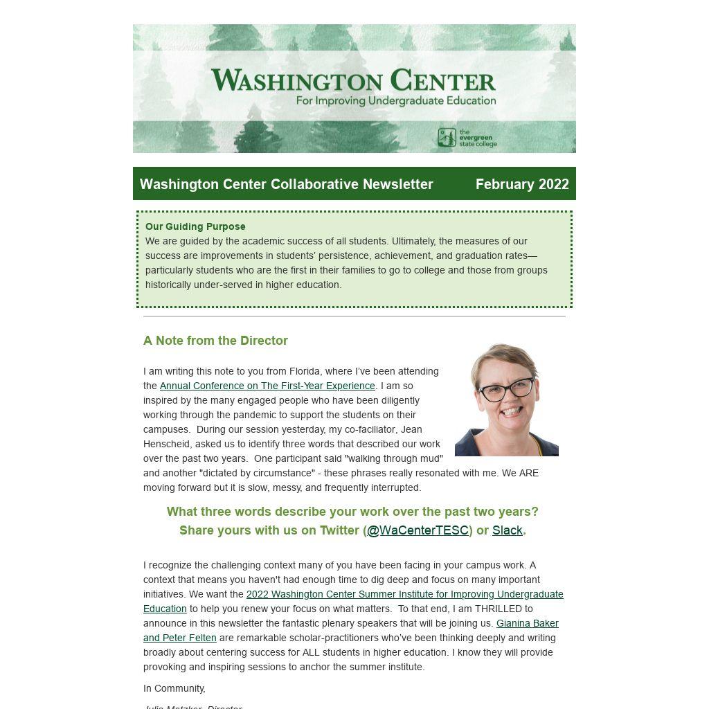 The Washington Center is seeking a program coordinator - Applications close on March 7 This position offers a great opportunity to do a deep dive into the work at colleges and universities and would be appropriate for those interested in starting a career in any aspect of higher education. To apply, visit the job posting at https://evergreen.peopleadmin.com/postings/3016.