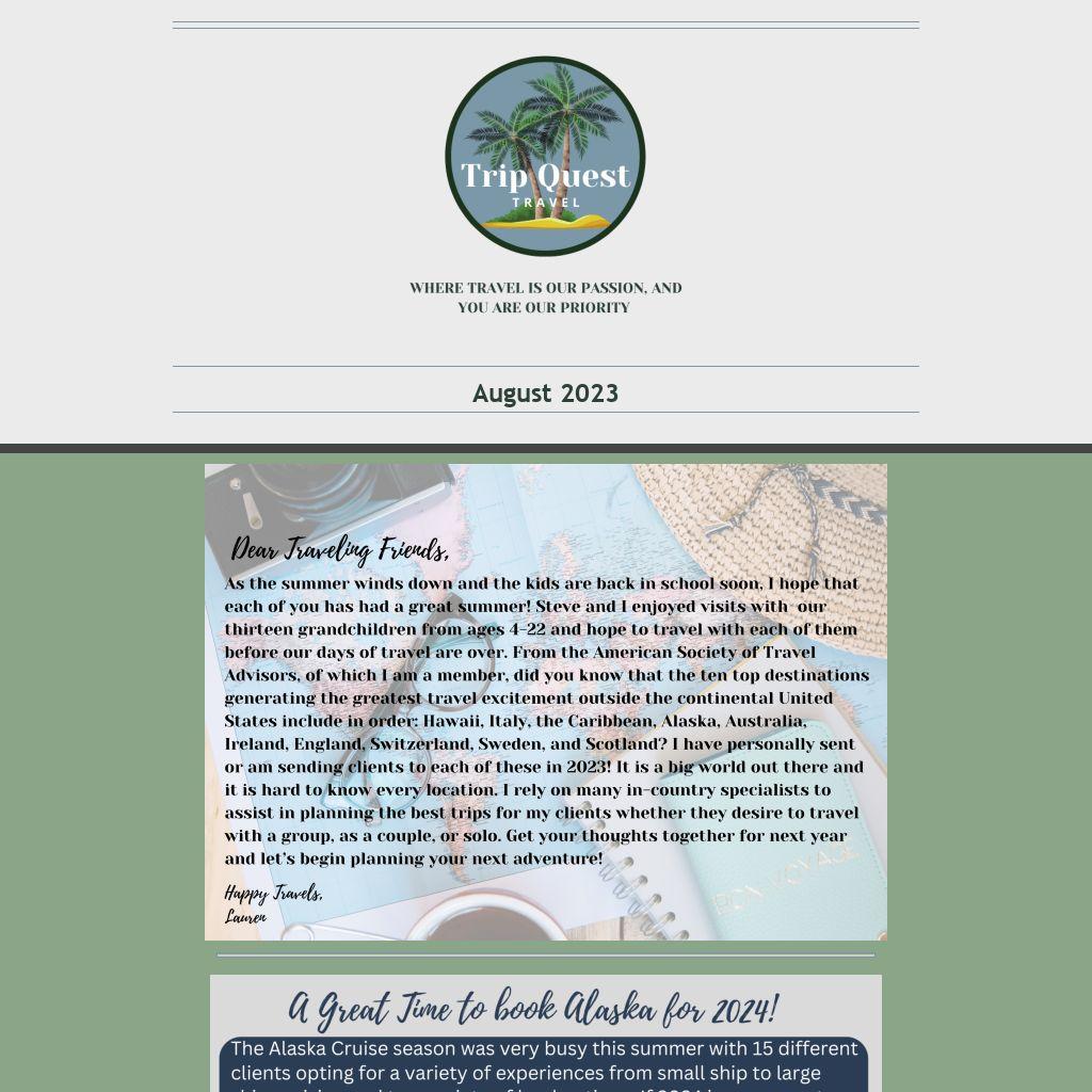 I am Lauren Williams, owner of Trip Quest Travel Services for the past seven years. Moving from three decades in education to becoming a travel consultant has caused me to shift from “The Doctor of Education” to “The Doctor of Travel.” My clients are often just like me – they want a rejuvenating vacation that teaches them about the world and the cultures around them. I love beautiful scenery, exploring new places, and learning something new every day! Aside from travel, I stay busy with my husband, Steve, who has joined me in the travel business, and our four children and thirteen grandchildren. Being active in the church and in our community feeds our souls as well. I love to play pickleball and bridge when I am not helping clients plan that perfect trip! Because our world is so much smaller now, I am happy to work with clients wherever they might live…but by referral only. Let me know if you have friends or family who would like to be added to my monthly newsletter list! Also, let me know if there is something you’d like to know more about!