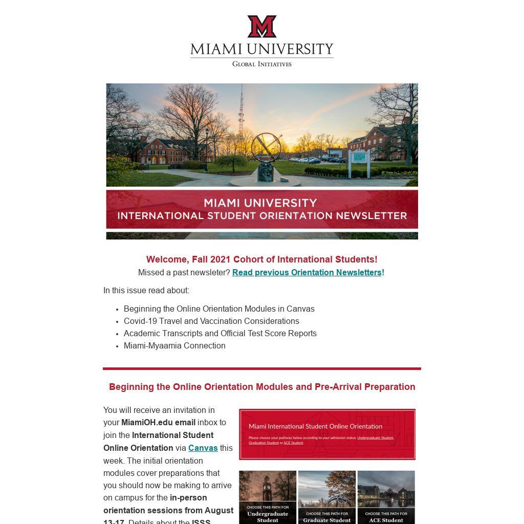 You will receive an invitation in your MiamiOH.edu email inbox to join the International Student Online Orientation via Canvas this week. The initial orientation modules cover preparations that you should now be making to arrive on campus for the in-person orientation sessions from August 13-17. Details about the ISSS pickup at the Cincinnati/Northern Kentucky (CVG) airport hotel on the morning of August 12 will be available in forthcoming newsletters/Canvas modules.