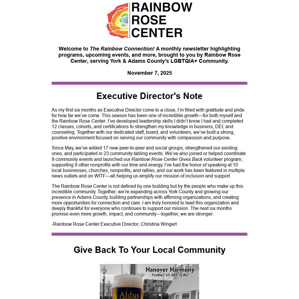 The Rainbow Rose Center is not defined by one building but by the people who make up this incredible community. Together, we’re expanding across York County and growing our presence in Adams County, building partnerships with affirming organizations, and creating more opportunities for connection and care. I am truly honored to lead this organization and deeply thankful for everyone who continues to support our mission. The next six months promise even more growth, impact, and community—together, we are stronger.