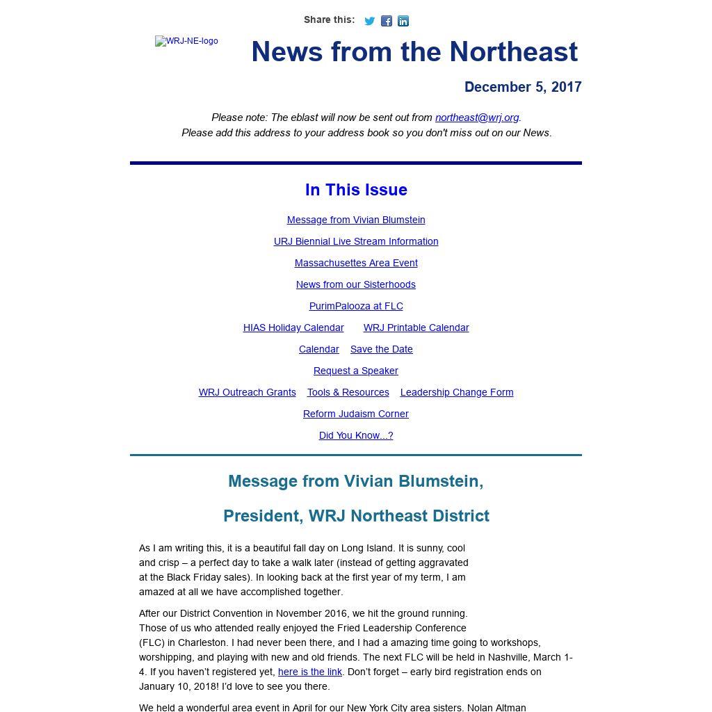 Please note: The eblast will now be sent out from northeast@wrj.org.