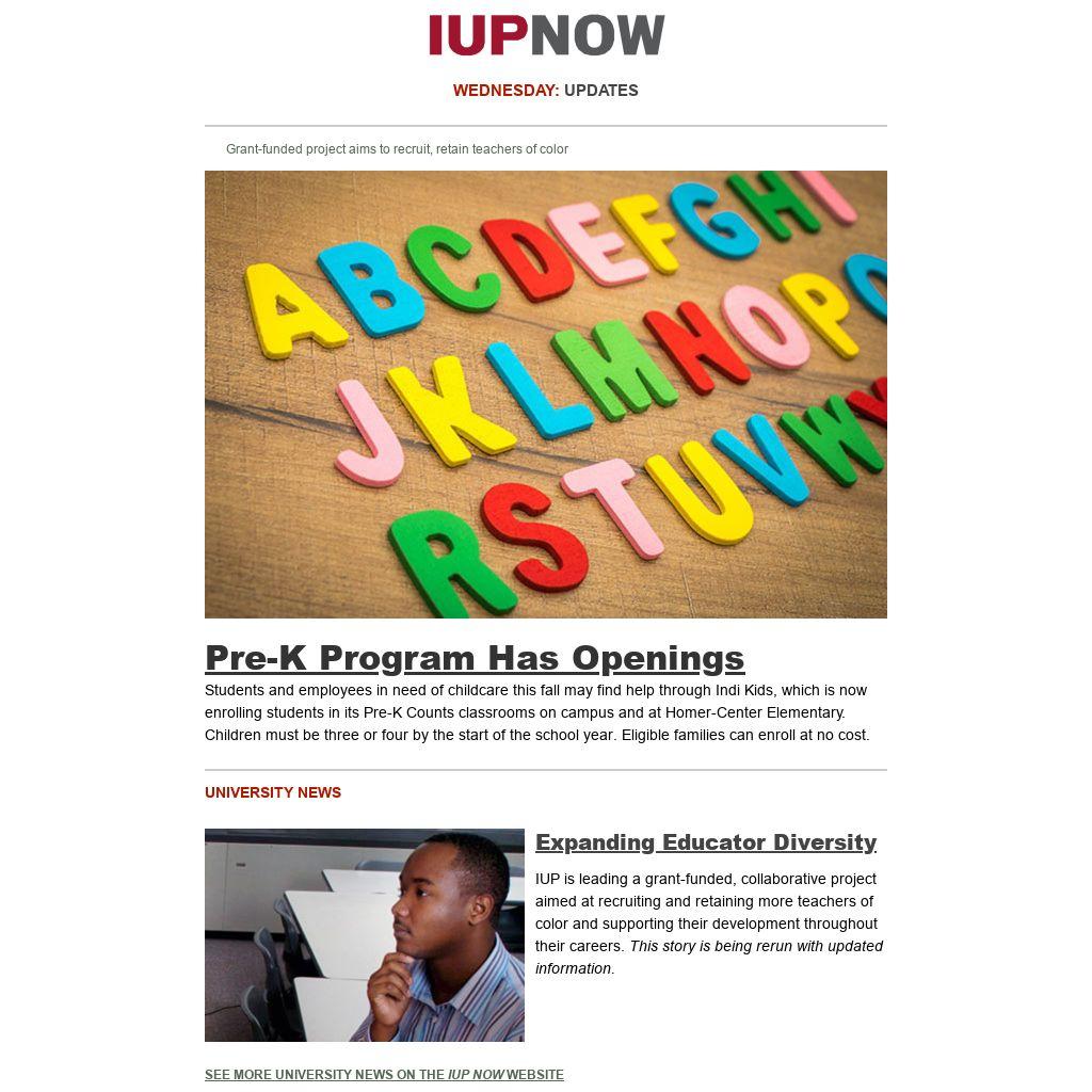Distributed to IUP employees and students three days a week on its summer schedule, IUP Now is the official newsletter of Indiana University of Pennsylvania. It features news from across the IUP website, compiled by the Division of Marketing and Communications. Find out how to get your news and events in IUP Now.