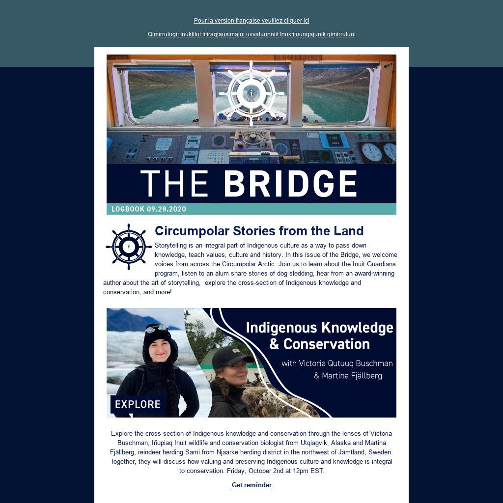 Storytelling is an integral part of Indigenous culture as a way to pass down knowledge, teach values, culture and history. In this issue of the Bridge, we welcome voices from across the Circumpolar Arctic. Join us to learn about the Inuit Guardians program, listen to an alum share stories of dog sledding, hear from an award-winning author about the art of storytelling, explore the cross-section of Indigenous knowledge and conservation, and more!