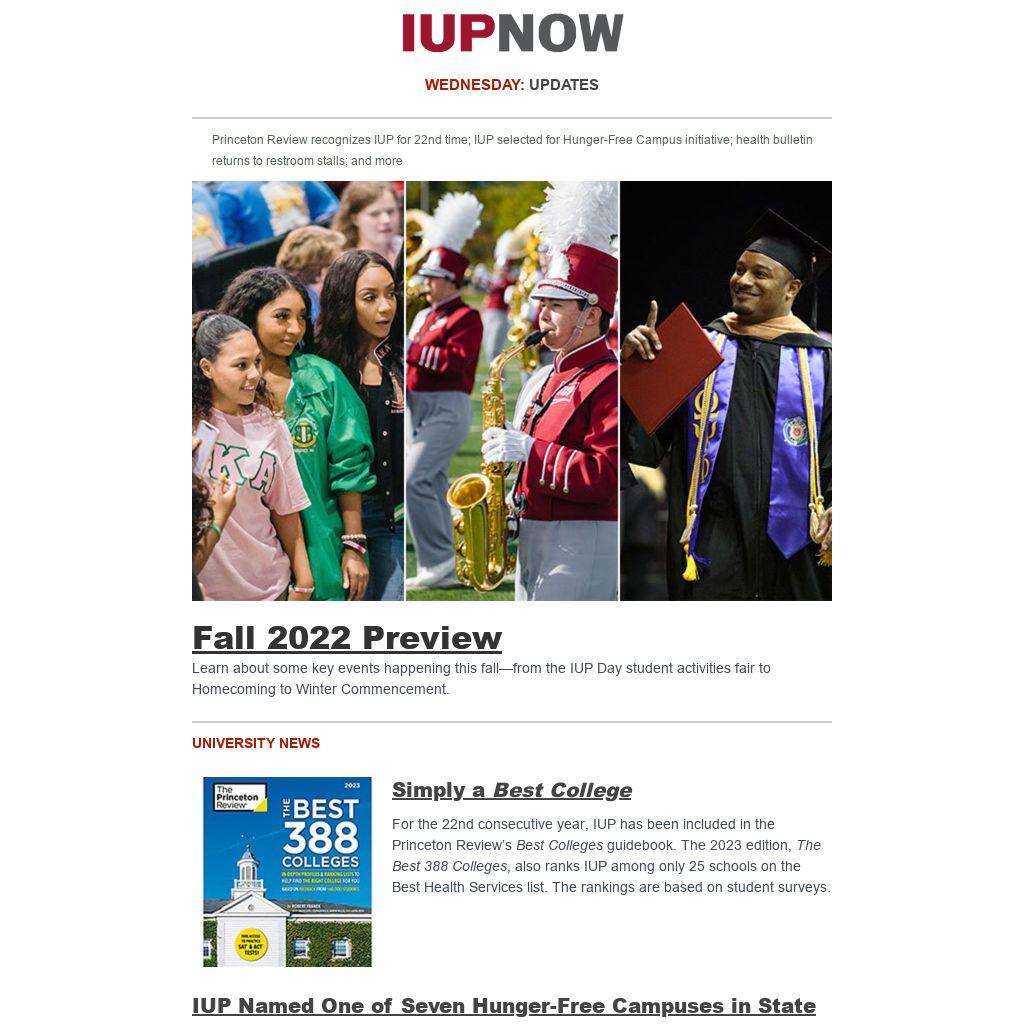 For the 22nd consecutive year, IUP has been included in the Princeton Review’s Best Colleges guidebook. The 2023 edition, The Best 388 Colleges, also ranks IUP among only 25 schools on the Best Health Services list. The rankings are based on student surveys.