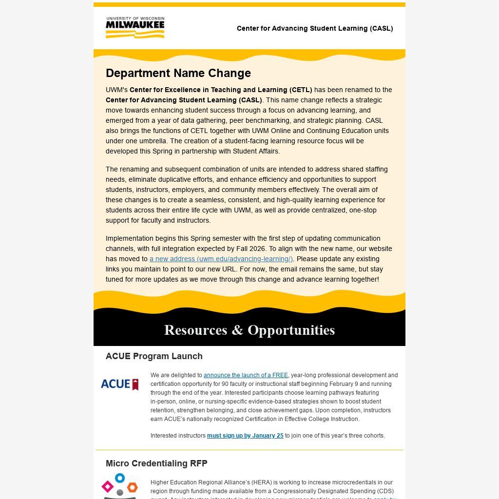 UWM's Center for Excellence in Teaching and Learning (CETL) has been renamed to the Center for Advancing Student Learning (CASL). This name change reflects a strategic move towards enhancing student success through a focus on advancing learning, and emerged from a year of data gathering, peer benchmarking, and strategic planning. CASL also brings the functions of CETL together with UWM Online and Continuing Education units under one umbrella. The creation of a student-facing learning resource focus will be developed this Spring in partnership with Student Affairs.