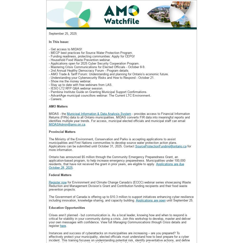 Ontario has announced $5 million through the Community Emergency Preparedness Grant, an application-based program, to help increase emergency preparedness. Municipalities under 100,000 residents, that have not received the grant in prior years, are eligible to apply. Applications are due October 28, 2025.