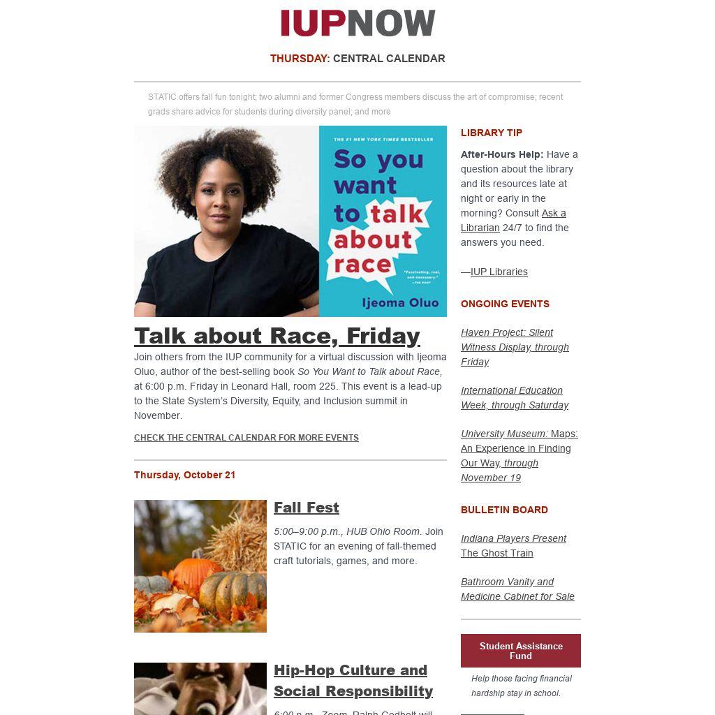 For more information on any item in IUP Now, please contact the department that posted the original item. To report an inaccuracy, please contact the posting department as well as the IUP Now production team at IUP-Now@iup.edu. Posting departments are responsible for the accuracy of items included in IUP Now.