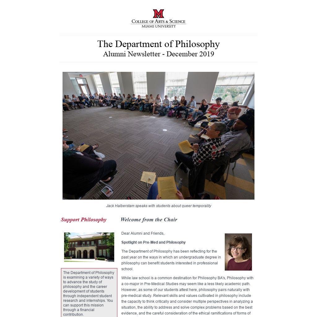 | The Department of Philosophy is examining a variety of ways to advance the study of philosophy and the career development of students through independent student research and internships. You can support this mission through a financial contribution.