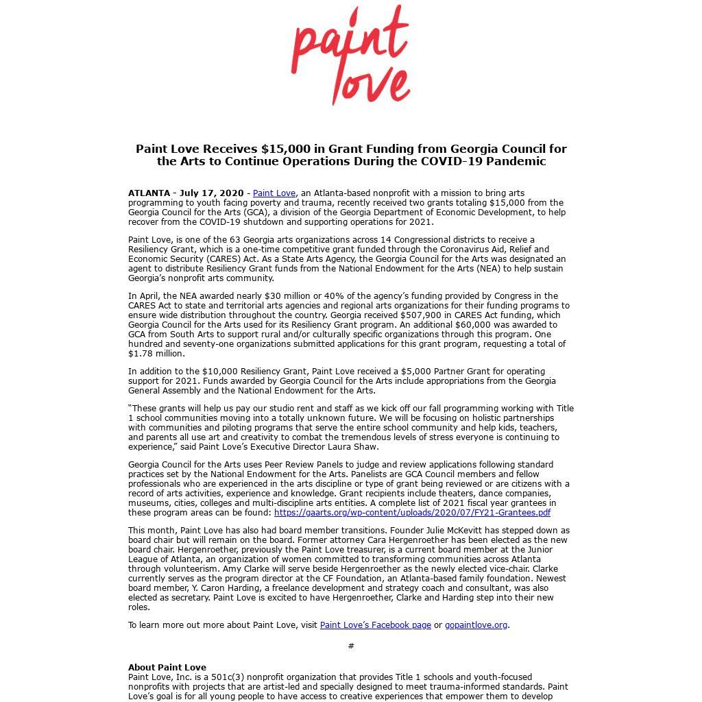 In addition to the $10,000 Resiliency Grant, Paint Love received a $5,000 Partner Grant for operating support for 2021. Funds awarded by Georgia Council for the Arts include appropriations from the Georgia General Assembly and the National Endowment for the Arts.