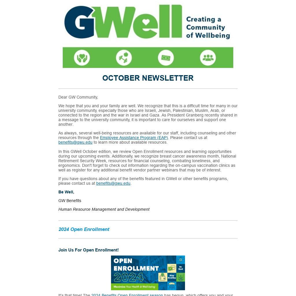 During Open Enrollment, we invite you to join us for our re-imagined in-person fests. Meet GW’s benefits vendor partners, ask questions, receive assistance with the enrollment process, and participate in activities such as our first annual Open Enrollment scavenger hunt, photo booth, yoga retreat, massages, and more! We will also be offering webinars and 1:1 appointments led by our benefits’ vendor partners to provide details about the 2024 benefit programs as well as tools and resources available to you. Please mark your calendars and visit our 2024 Open Enrollment webpage to review the Open Enrollment Guide, Benefits Overview, and other helpful tools and resources.