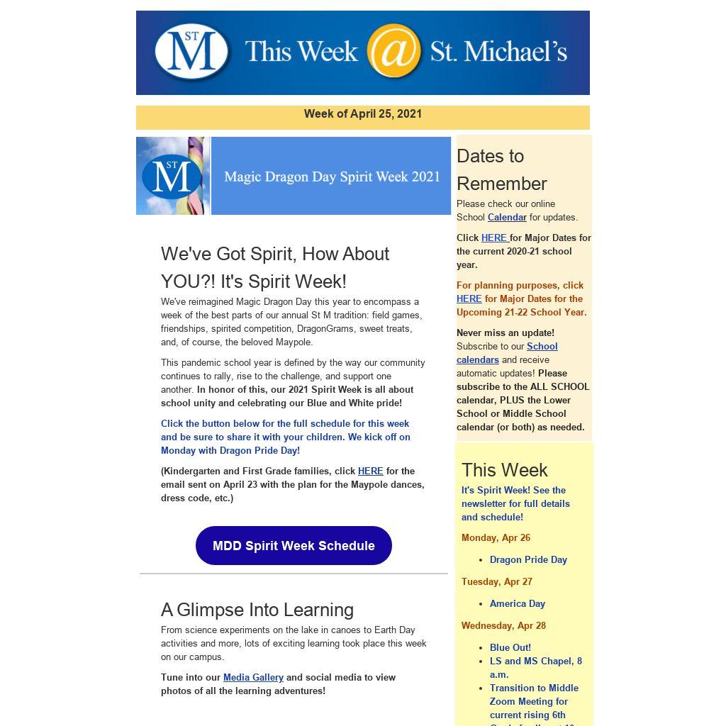 We've Got Spirit, How About YOU?! It's Spirit Week!We've reimagined Magic Dragon Day this year to encompass a week of the best parts of our annual St M tradition: field games, friendships, spirited competition, DragonGrams, sweet treats, and, of course, the beloved Maypole.