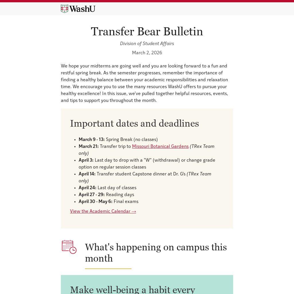 We hope your midterms are going well and you are looking forward to a fun and restful spring break. As the semester progresses, remember the importance of finding a healthy balance between your academic responsibilities and relaxation time. We encourage you to use the many resources WashU offers to pursue your healthy excellence! In this issue, we’ve pulled together helpful resources, events, and tips to support you throughout the month.