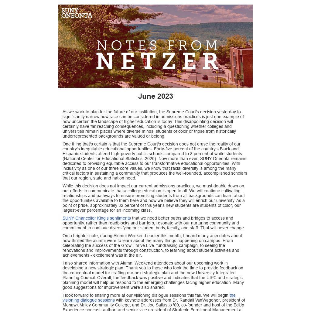 | As we work to plan for the future of our institution, the Supreme Court's decision yesterday to significantly narrow how race can be considered in admissions practices is just one example of how uncertain the landscape of higher education is today. This disappointing decision will certainly have far-reaching consequences, including a questioning whether colleges and universities remain places where diverse minds, students of color or those from historically underrepresented backgrounds are valued or belong.