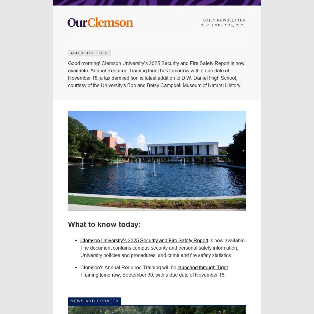 Good morning! Clemson University’s 2025 Security and Fire Safety Report is now available. Annual Required Training launches tomorrow with a due date of November 18; a taxidermied lion is latest addition to D.W. Daniel High School, courtesy of the University's Bob and Betsy Campbell Museum of Natural History.