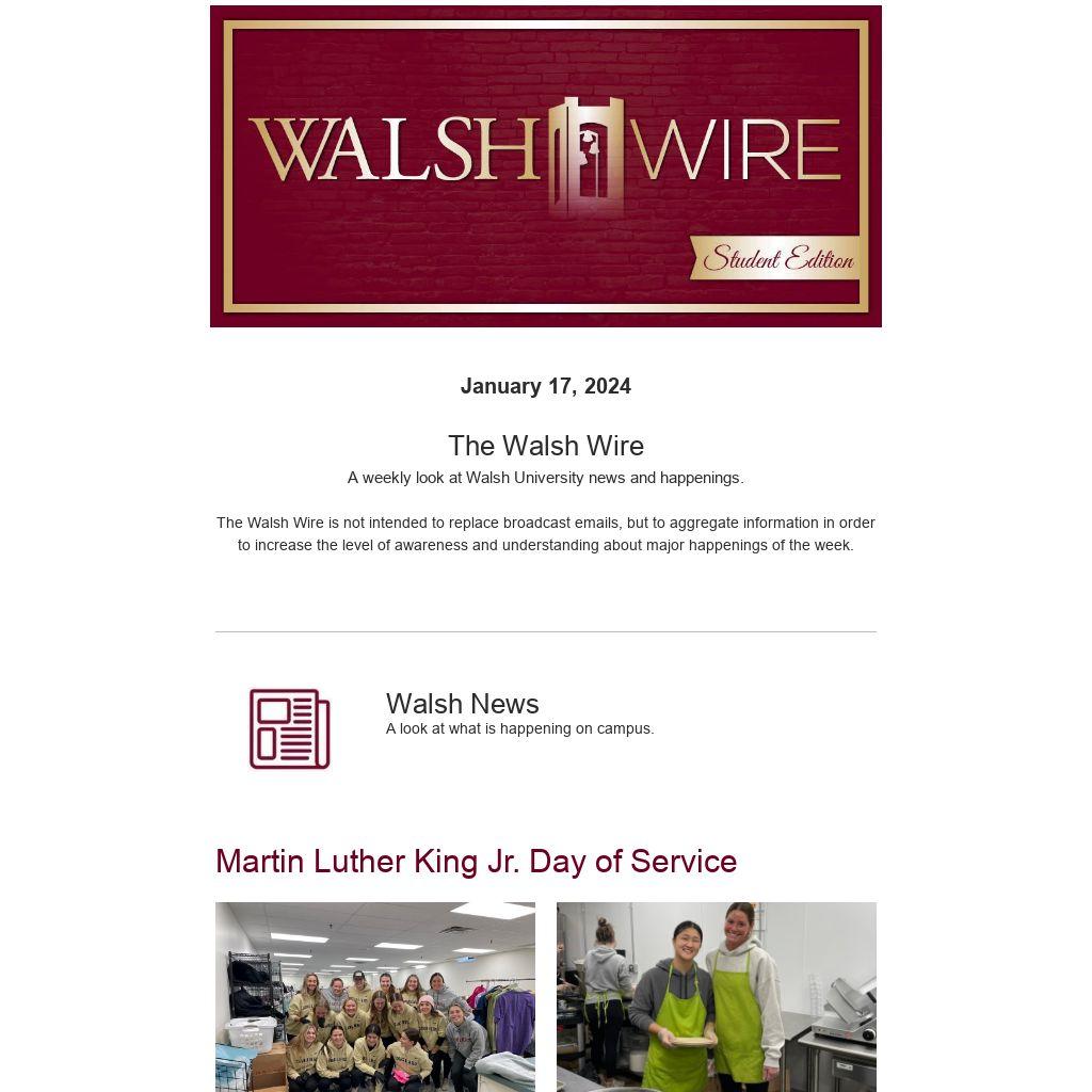 The Walsh Wire is not intended to replace broadcast emails, but to aggregate information in order to increase the level of awareness and understanding about major happenings of the week.