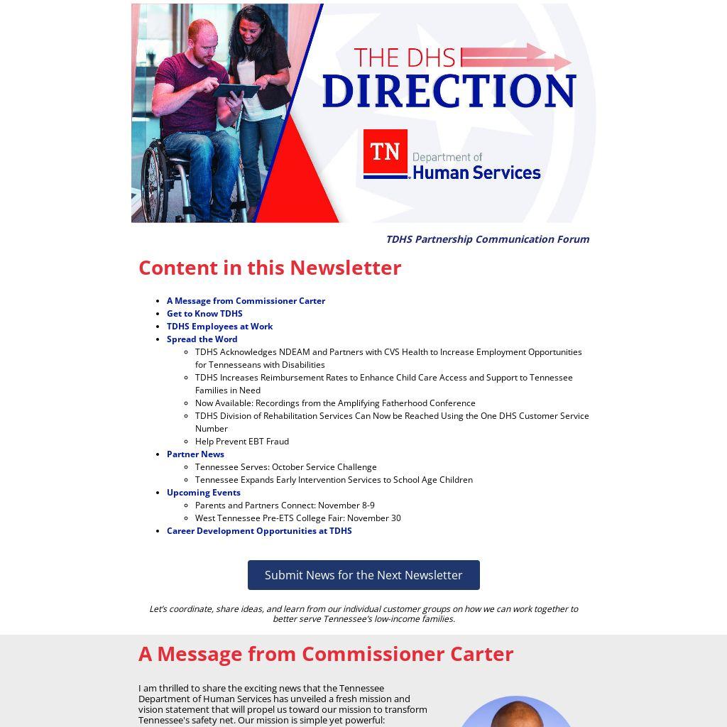 I am thrilled to share the exciting news that the Tennessee Department of Human Services has unveiled a fresh mission and vision statement that will propel us toward our mission to transform Tennessee's safety net. Our mission is simple yet powerful: "Strengthen Tennessee by Strengthening Tennesseans."