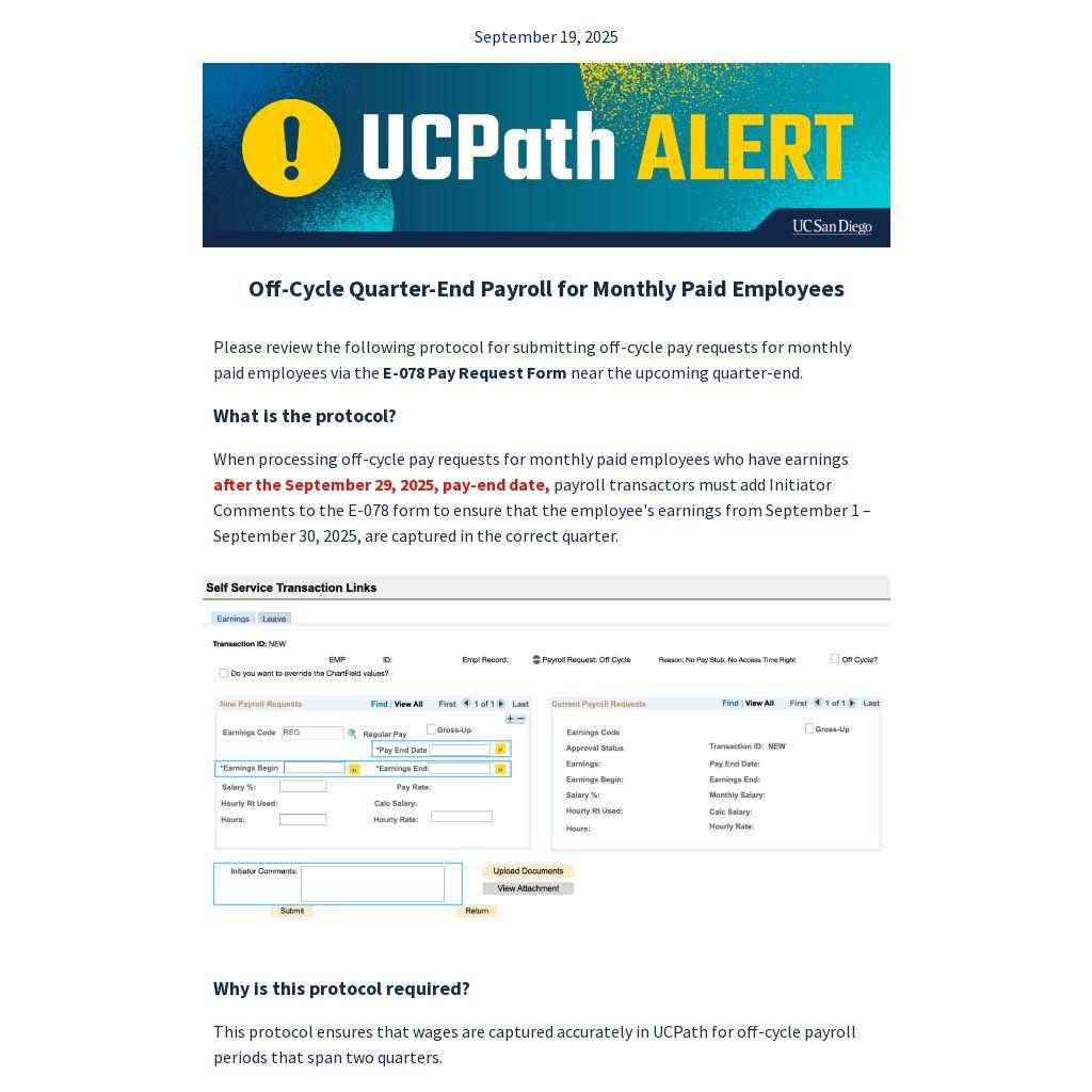When processing off-cycle pay requests for monthly paid employees who have earnings after the September 29, 2025, pay-end date, payroll transactors must add Initiator Comments to the E-078 form to ensure that the employee's earnings from September 1 – September 30, 2025, are captured in the correct quarter.