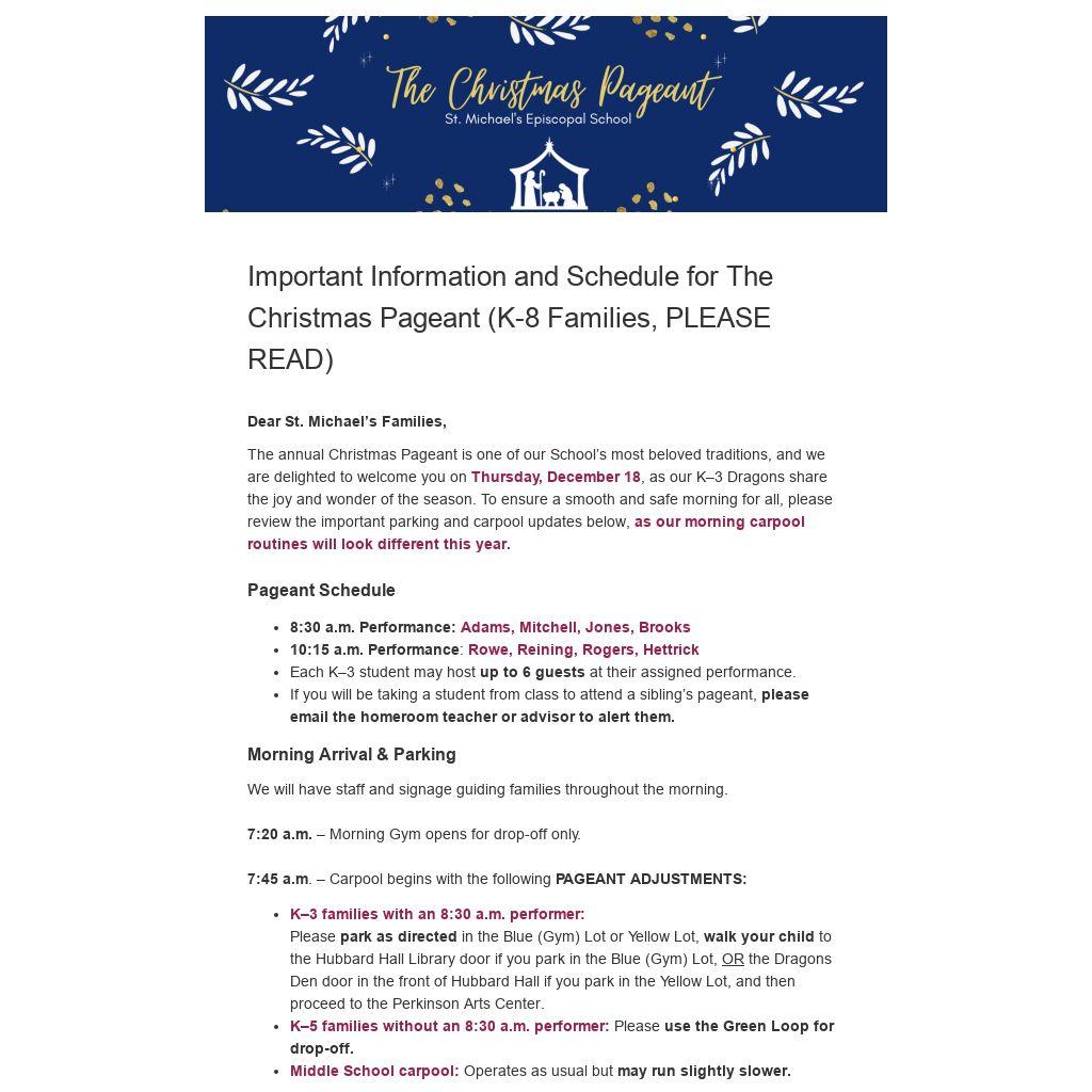 The annual Christmas Pageant is one of our School’s most beloved traditions, and we are delighted to welcome you on Thursday, December 18, as our K–3 Dragons share the joy and wonder of the season. To ensure a smooth and safe morning for all, please review the important parking and carpool updates below, as our morning carpool routines will look different this year.