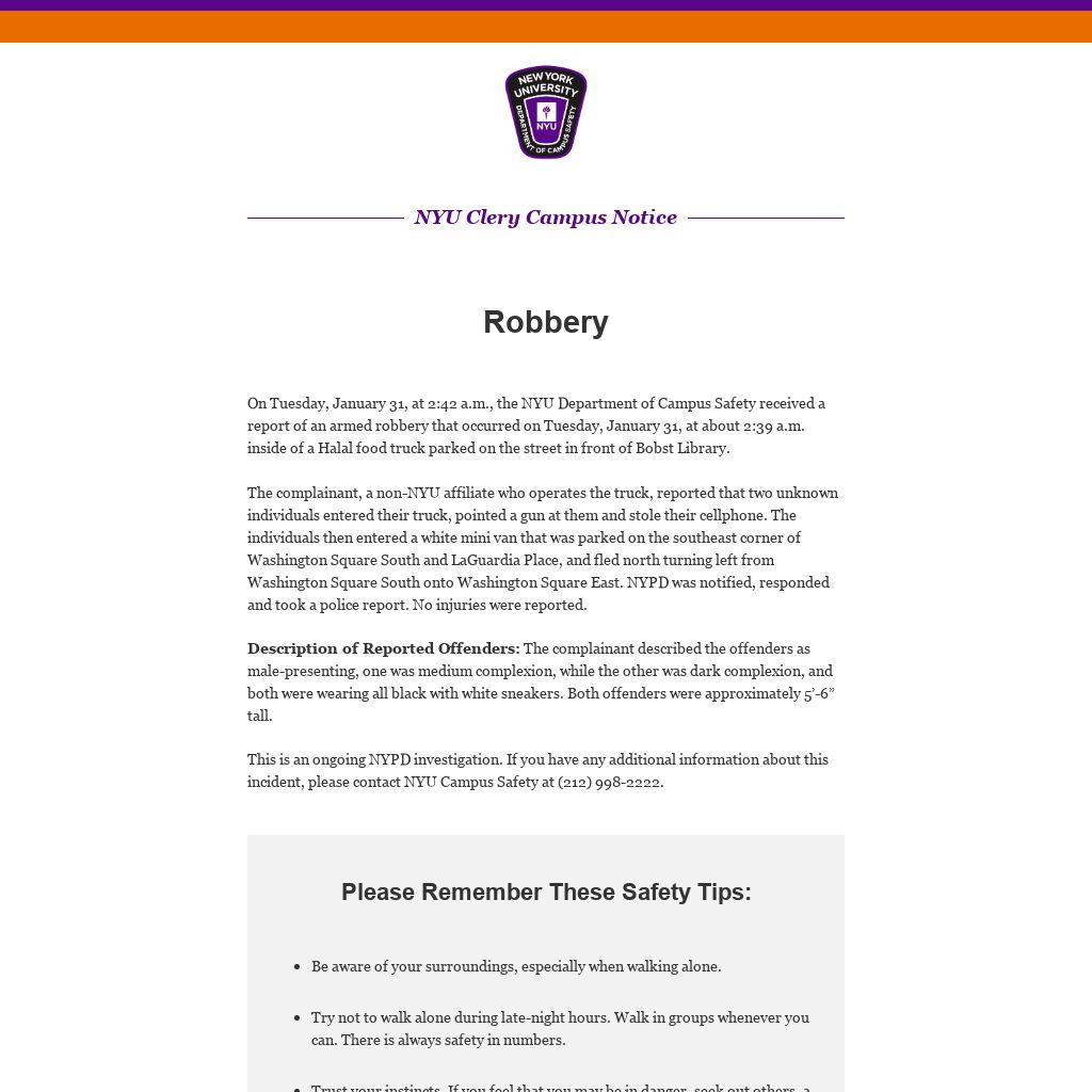 On Tuesday, January 31, at 2:42 a.m., the NYU Department of Campus Safety received a report of an armed robbery that occurred on Tuesday, January 31, at about 2:39 a.m. inside of a Halal food truck parked on the street in front of Bobst Library.