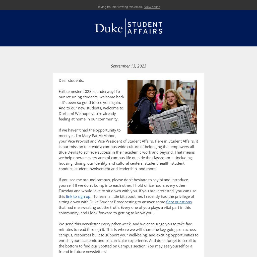 We send this newsletter every other week, and we encourage you to take five minutes to read through it. This is where we will share the key goings on across campus, resources built to support your well-being, and exciting opportunities to enrich your academic and co-curricular experience. And don't forget to scroll to the bottom to find our Spotted on Campus section. You may see yourself or a friend in future newsletters!