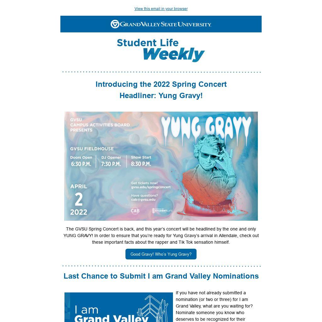 If you have not already submitted a nomination (or two or three) for I am Grand Valley, what are you waiting for? Nominate someone you know who deserves to be recognized for their service, involvement, hard work, and leadership. The deadline to submit nominations is TODAY at 5 p.m., so don’t miss your shot to recognize another Laker!