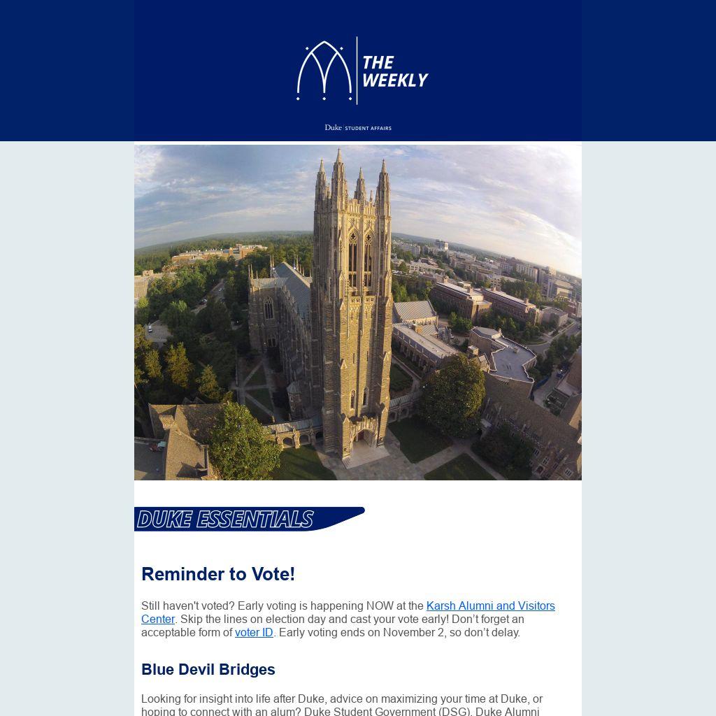 Looking for insight into life after Duke, advice on maximizing your time at Duke, or hoping to connect with an alum? Duke Student Government (DSG), Duke Alumni Engagement and Development, and the Duke Career Center are excited to bring back Blue Devil Bridges, an alumni-student mentorship program.