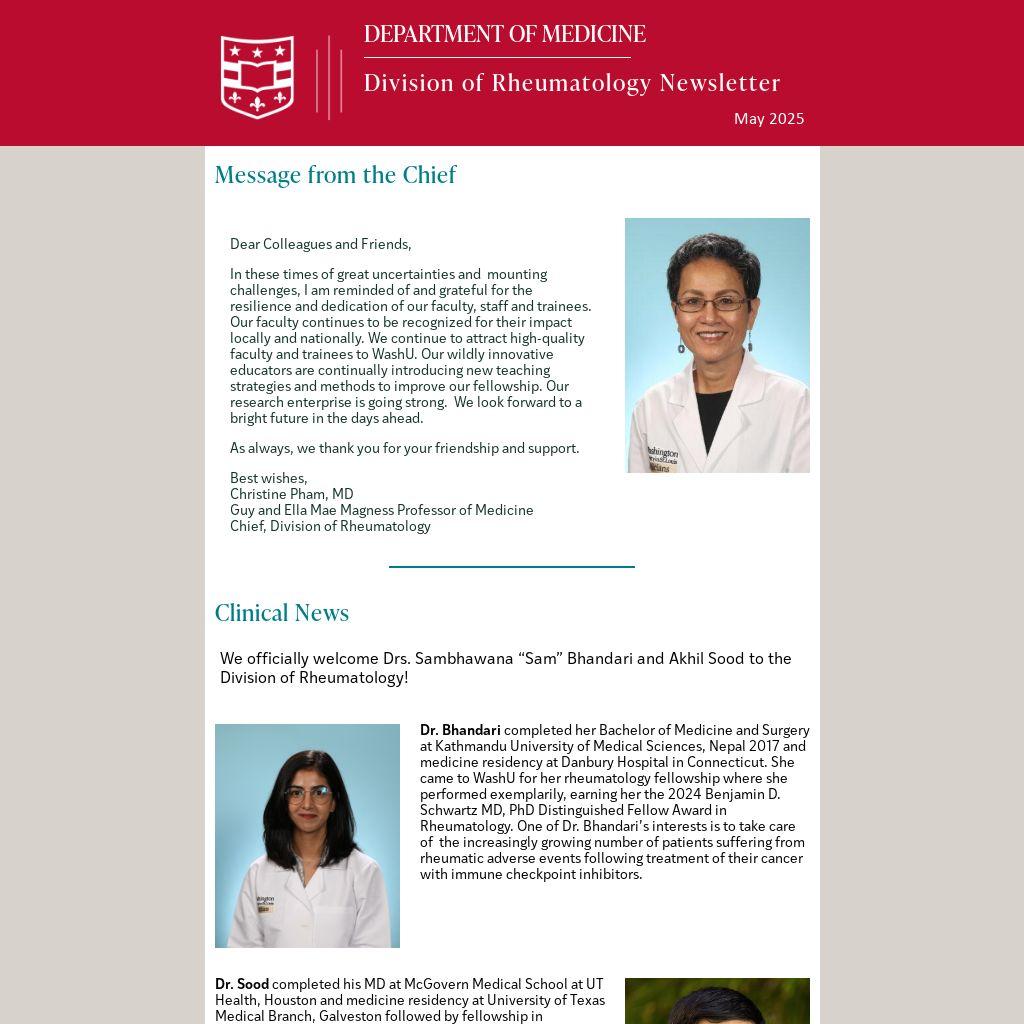Dr. Bhandari completed her Bachelor of Medicine and Surgery at Kathmandu University of Medical Sciences, Nepal 2017 and medicine residency at Danbury Hospital in Connecticut. She came to WashU for her rheumatology fellowship where she performed exemplarily, earning her the 2024 Benjamin D. Schwartz MD, PhD Distinguished Fellow Award in Rheumatology. One of Dr. Bhandari’s interests is to take care of the increasingly growing number of patients suffering from rheumatic adverse events following treatment of their cancer with immune checkpoint inhibitors.