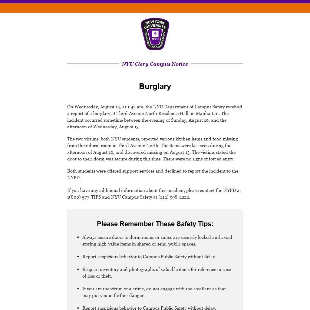 On Wednesday, August 14, at 1:42 am, the NYU Department of Campus Safety received a report of a burglary at Third Avenue North Residence Hall, in Manhattan. The incident occurred sometime between the evening of Sunday, August 10, and the afternoon of Wednesday, August 13.