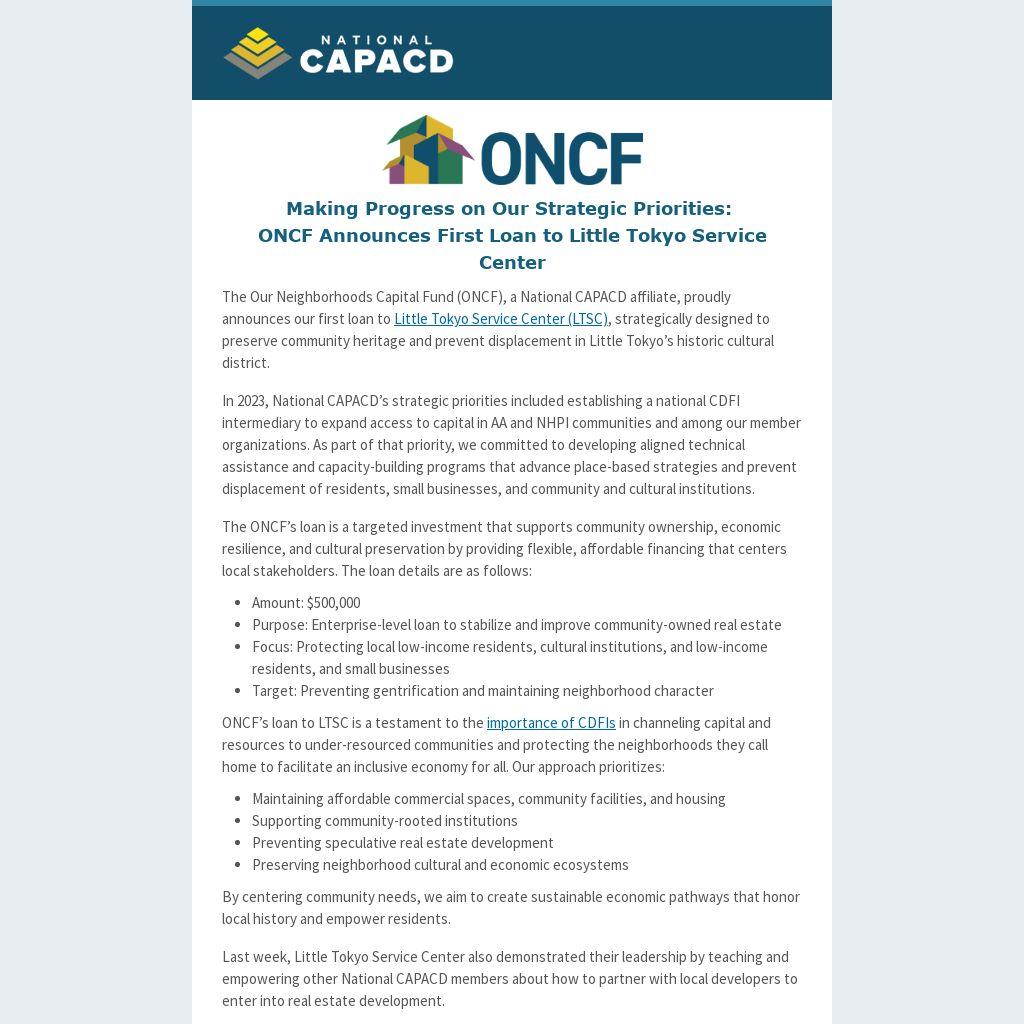 The Our Neighborhoods Capital Fund (ONCF), a National CAPACD affiliate, proudly announces our first loan to Little Tokyo Service Center (LTSC), strategically designed to preserve community heritage and prevent displacement in Little Tokyo’s historic cultural district.