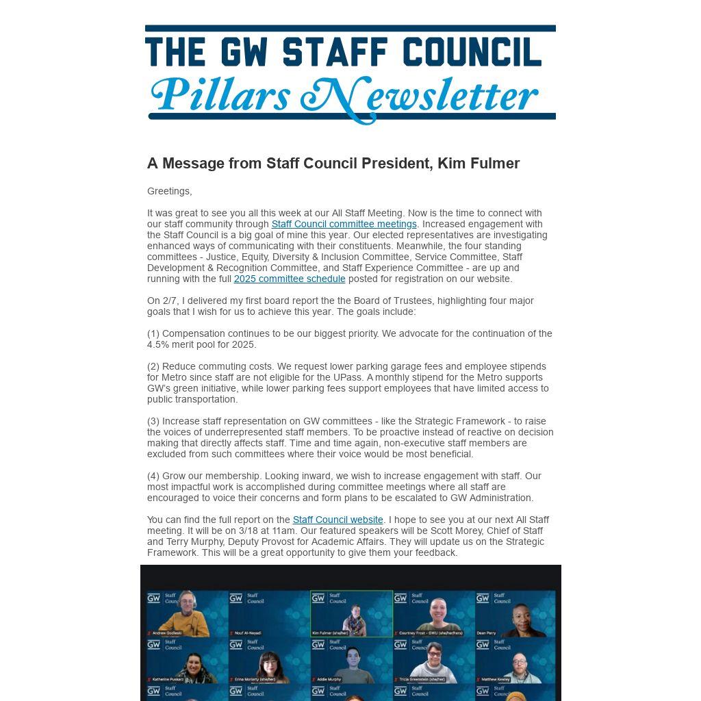 It was great to see you all this week at our All Staff Meeting. Now is the time to connect with our staff community through Staff Council committee meetings. Increased engagement with the Staff Council is a big goal of mine this year. Our elected representatives are investigating enhanced ways of communicating with their constituents. Meanwhile, the four standing committees - Justice, Equity, Diversity & Inclusion Committee, Service Committee, Staff Development & Recognition Committee, and Staff Experience Committee - are up and running with the full 2025 committee schedule posted for registration on our website.