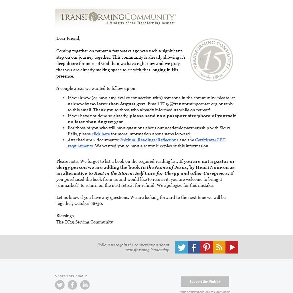 - If you know (or have any level of connection with) someone in the community, please let us know by no later than August 31st. Email TC15@transformingcenter.org or reply to this email. Thank you to those who already informed us while on retreat!