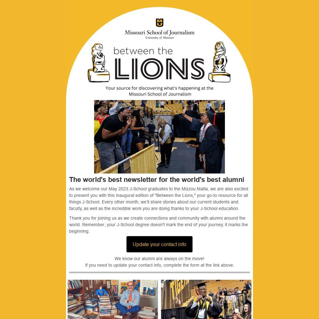 As we welcome our May 2023 J-School graduates to the Mizzou Mafia, we are also excited to present you with this inaugural edition of "Between the Lions," your go-to resource for all things J-School. Every other month, we’ll share stories about our current students and faculty, as well as the incredible work you are doing thanks to your J-School education.