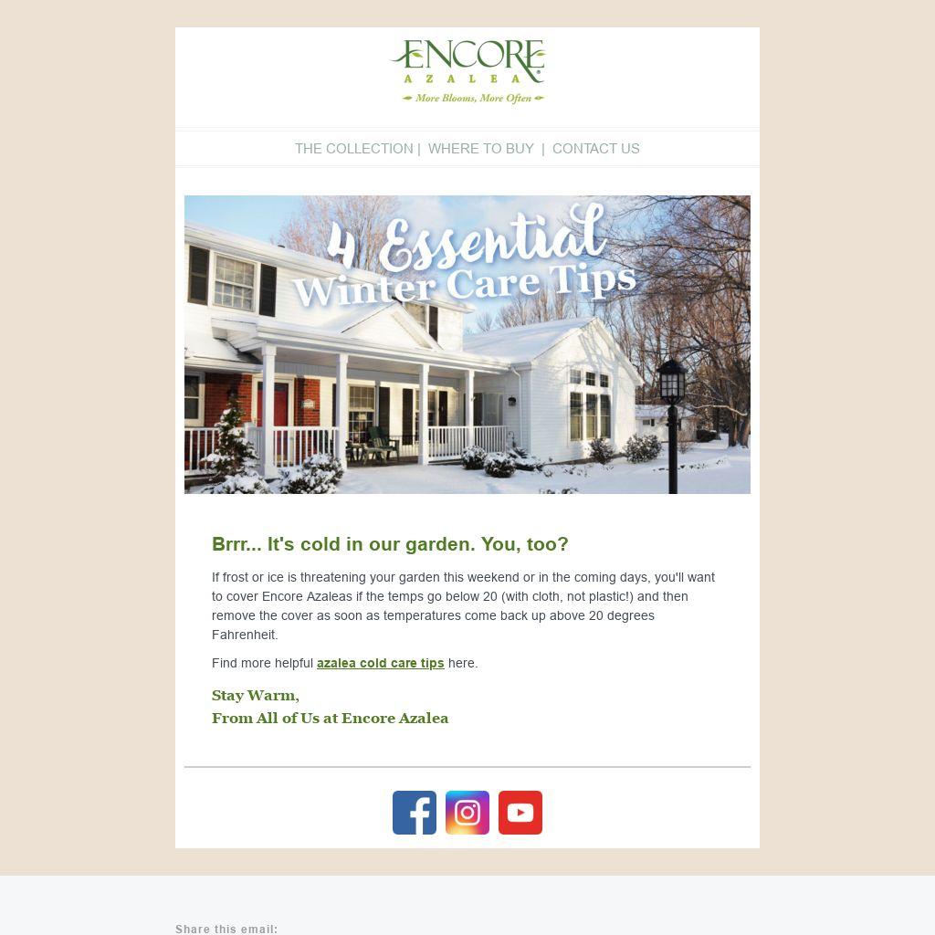 If frost or ice is threatening your garden this weekend or in the coming days, you'll want to cover Encore Azaleas if the temps go below 20 (with cloth, not plastic!) and then remove the cover as soon as temperatures come back up above 20 degrees Fahrenheit.