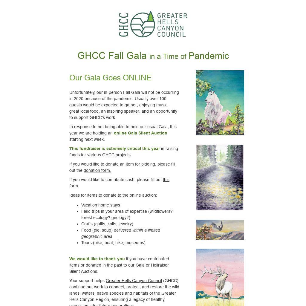 Unfortunately, our in-person Fall Gala will not be occurring in 2020 because of the pandemic. Usually over 100 guests would be expected to gather, enjoying music,  great local food, an inspiring speaker, and an opportunity to support GHCC's work.