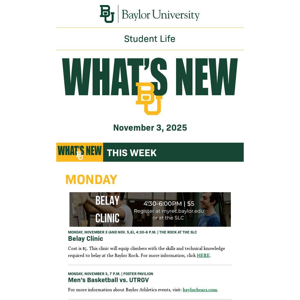 If you are a department or Baylor student organization and have items you would like to see appear in What's New BU, submit them for consideration by Friday at 8 a.m. by clicking here or emailing them to whatsnew@baylor.edu. View past issues of What’s New BU here.
