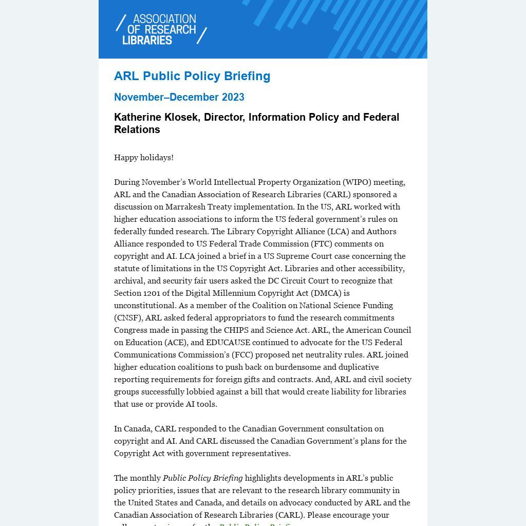 During November’s World Intellectual Property Organization (WIPO) meeting, ARL and the Canadian Association of Research Libraries (CARL) sponsored a discussion on Marrakesh Treaty implementation. In the US, ARL worked with higher education associations to inform the US federal government’s rules on federally funded research. The Library Copyright Alliance (LCA) and Authors Alliance responded to US Federal Trade Commission (FTC) comments on copyright and AI. LCA joined a brief in a US Supreme Court case concerning the statute of limitations in the US Copyright Act. Libraries and other accessibility, archival, and security fair users asked the DC Circuit Court to recognize that Section 1201 of the Digital Millennium Copyright Act (DMCA) is unconstitutional. As a member of the Coalition on National Science Funding (CNSF), ARL asked federal appropriators to fund the research commitments Congress made in passing the CHIPS and Science Act. ARL, the American Council on Education (ACE), and EDUCAUSE continued to advocate for the US Federal Communications Commission’s (FCC) proposed net neutrality rules. ARL joined higher education coalitions to push back on burdensome and duplicative reporting requirements for foreign gifts and contracts. And, ARL and civil society groups successfully lobbied against a bill that would create liability for libraries that use or provide AI tools.