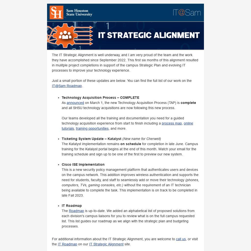 The IT Strategic Alignment is well underway, and I am very proud of the team and the work they have accomplished since September 2022. This first six months of this alignment resulted in mulitple project completions in support of the campus Strategic Plan and evolving IT processes to improve your technology experience.