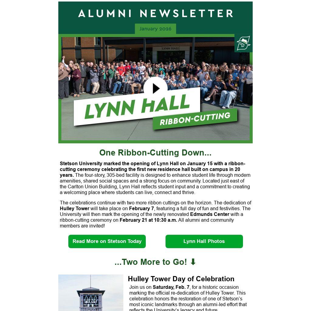 Join us on Saturday, Feb. 7, for a historic occasion marking the official re-dedication of Hulley Tower. This celebration honors the restoration of one of Stetson’s most iconic landmarks through an alumni-led effort that reflects the University’s legacy and future.