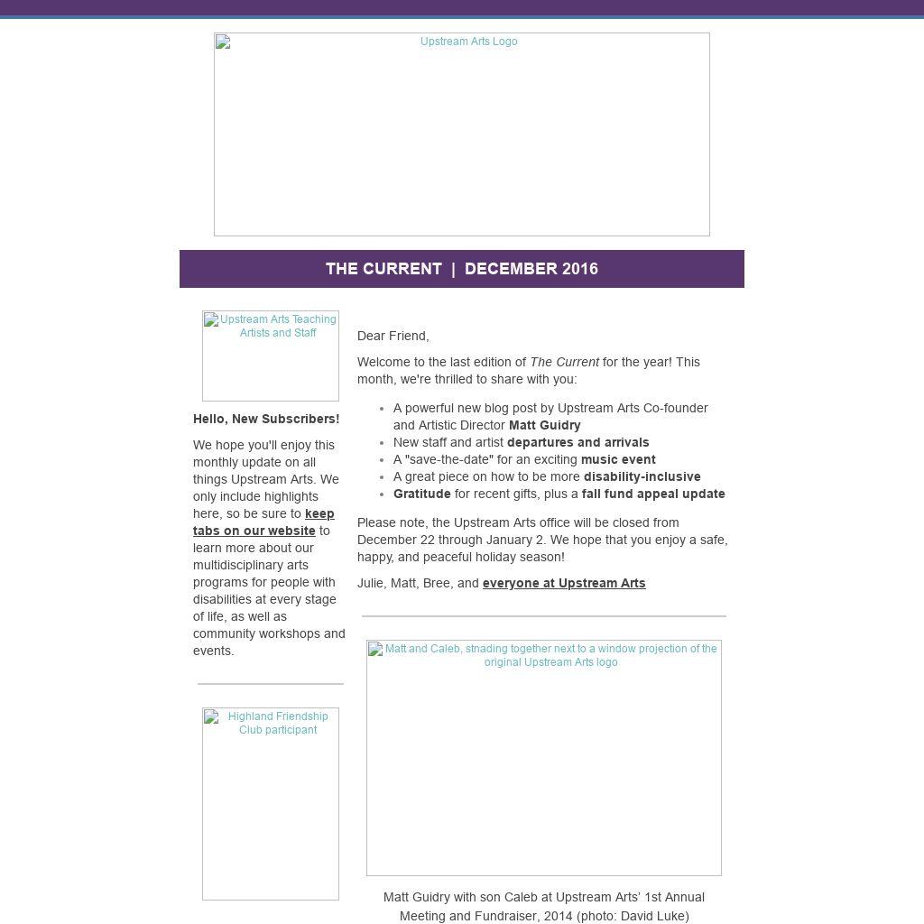 | Gratitude & The Work Ahead As you might already know, Upstream Arts has a goal of raising $100,000 from our individual donors by the end of our fiscal year on June 30, 2017. Thanks to your generosity over the past few weeks, we're 25% of the way there! Toward the big push ahead, we now have a mini goal of raising another $5,000 by December 31 (also the last day to make gifts for 2016 tax deduction eligibility).