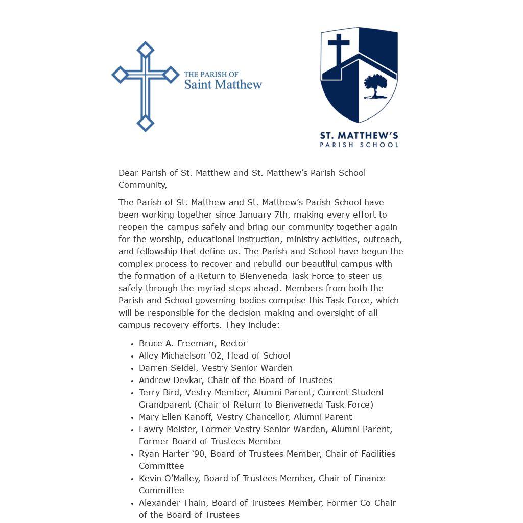 The Parish of St. Matthew and St. Matthew’s Parish School have been working together since January 7th, making every effort to reopen the campus safely and bring our community together again for the worship, educational instruction, ministry activities, outreach, and fellowship that define us. The Parish and School have begun the complex process to recover and rebuild our beautiful campus with the formation of a Return to Bienveneda Task Force to steer us safely through the myriad steps ahead. Members from both the Parish and School governing bodies comprise this Task Force, which will be responsible for the decision-making and oversight of all campus recovery efforts. They include: