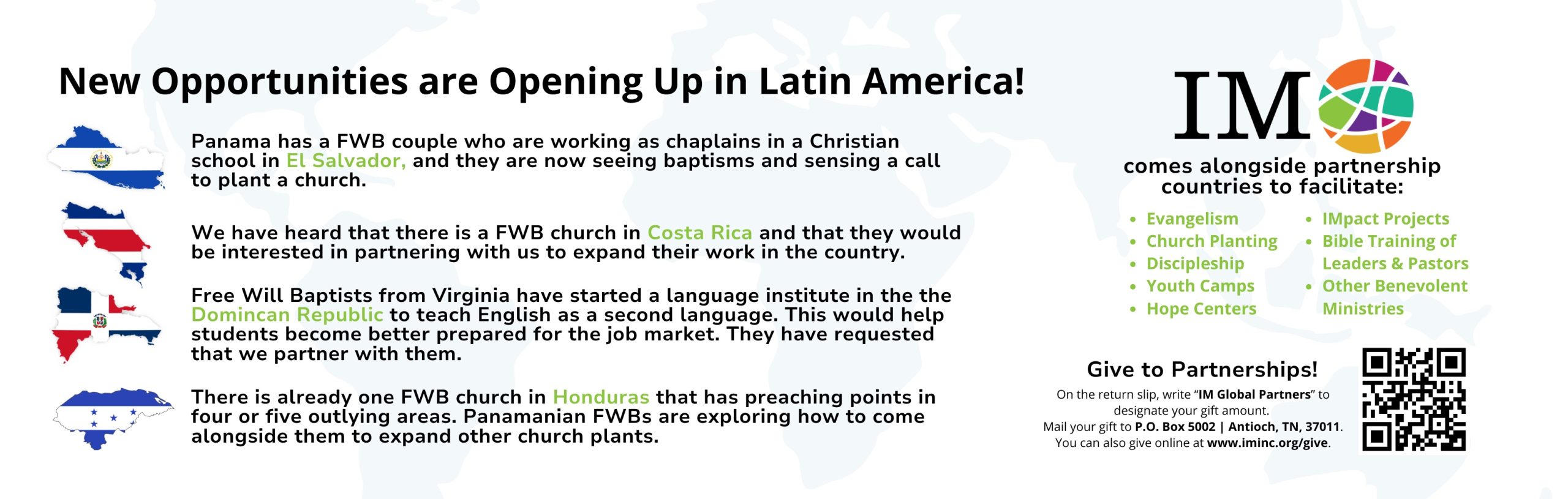 We are excited about the new opportunities the Lord has been opening in Latin America over the last few months. We invite you to join us in praying for wisdom about these possibilities. Watch this new video here to learn more! You can give to partnerships here or through the World Missions Offering to support the tangible resources for each of these ministries. Your generosity enables you to be a part of sharing the Gospel around the world.