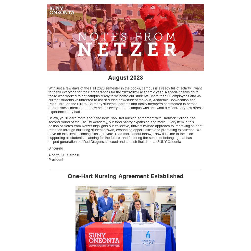 Below, you'll learn more about the new One-Hart nursing agreement with Hartwick College, the second round of the Faculty Academy, our food pantry expansion and more. Every item in this edition of Notes from Netzer highlights our collective, university-wide approach to improving student retention through nurturing student growth, expanding opportunities and promoting excellence. We have an excellent incoming class (as you'll read more about below). Now it is time to focus on supporting all students, planning for the future, and fostering the sense of belonging that has helped generations of Red Dragons succeed and cherish their time at SUNY Oneonta.