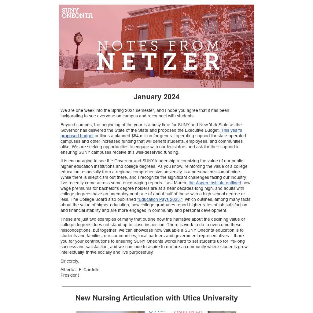 Beyond campus, the beginning of the year is a busy time for SUNY and New York State as the Governor has delivered the State of the State and proposed the Executive Budget. This year's proposed budget outlines a planned $54 million for general operating support for state-operated campuses and other increased funding that will benefit students, employees, and communities alike. We are seeking opportunities to engage with our legislators and ask for their support in ensuring SUNY campuses receive this well-deserved funding.