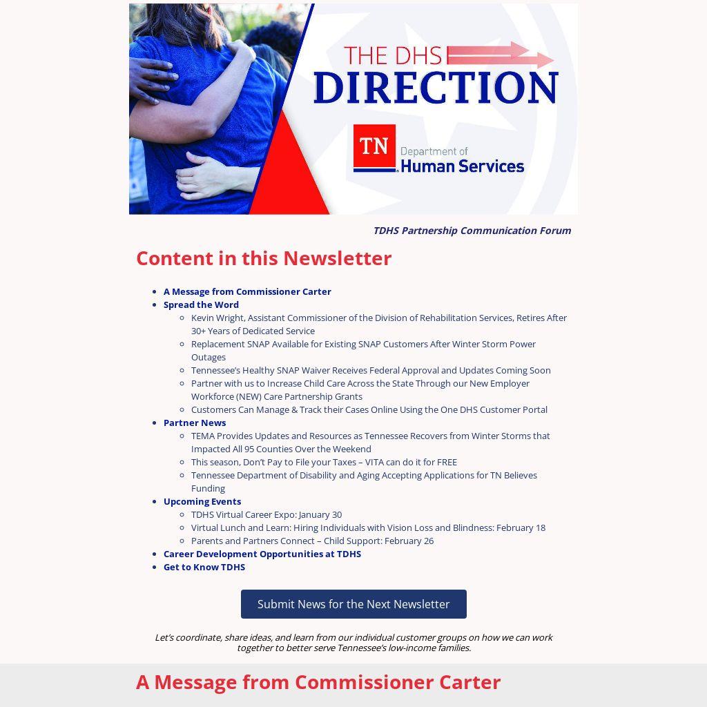Happy New Year! I am excited to begin another year of productivity and impact alongside my TDHS family as we continue supporting Tennessee families. As we enter this new year, I am proud to share an important update on our collective progress.