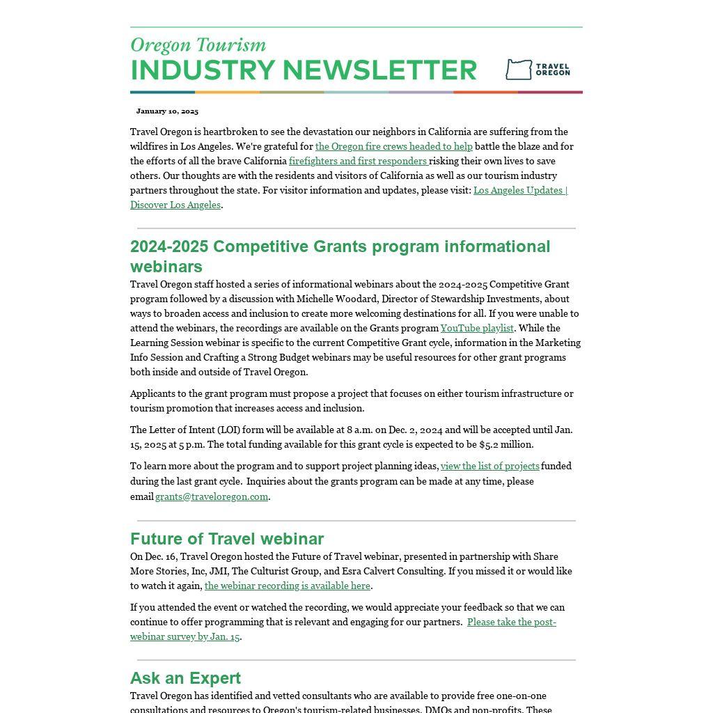 Travel Oregon staff hosted a series of informational webinars about the 2024-2025 Competitive Grant program followed by a discussion with Michelle Woodard, Director of Stewardship Investments, about ways to broaden access and inclusion to create more welcoming destinations for all. If you were unable to attend the webinars, the recordings are available on the Grants program