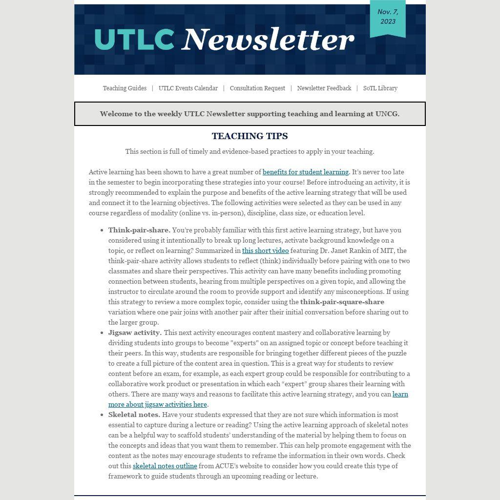 Welcome to the weekly UTLC Newsletter supporting teaching and learning at UNCG.